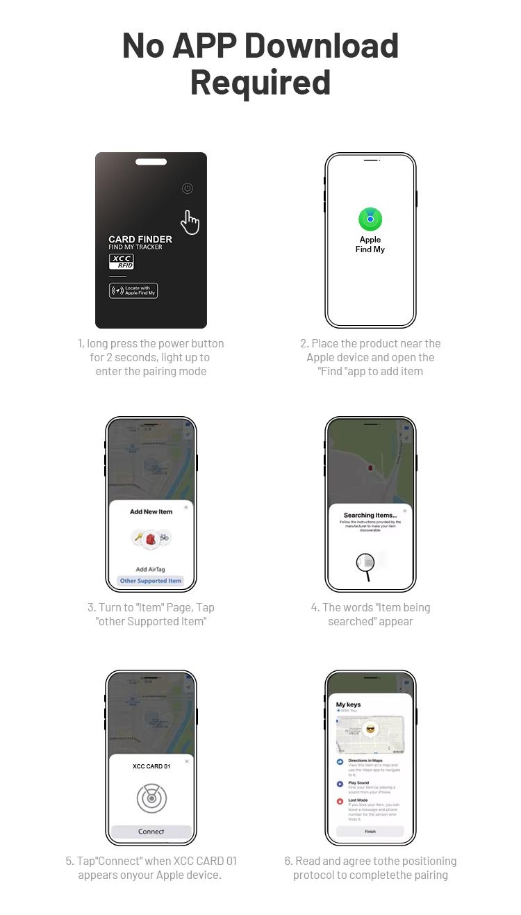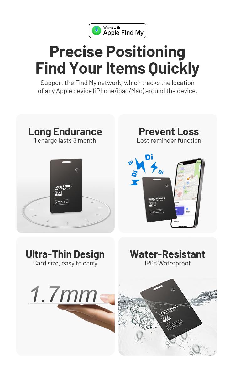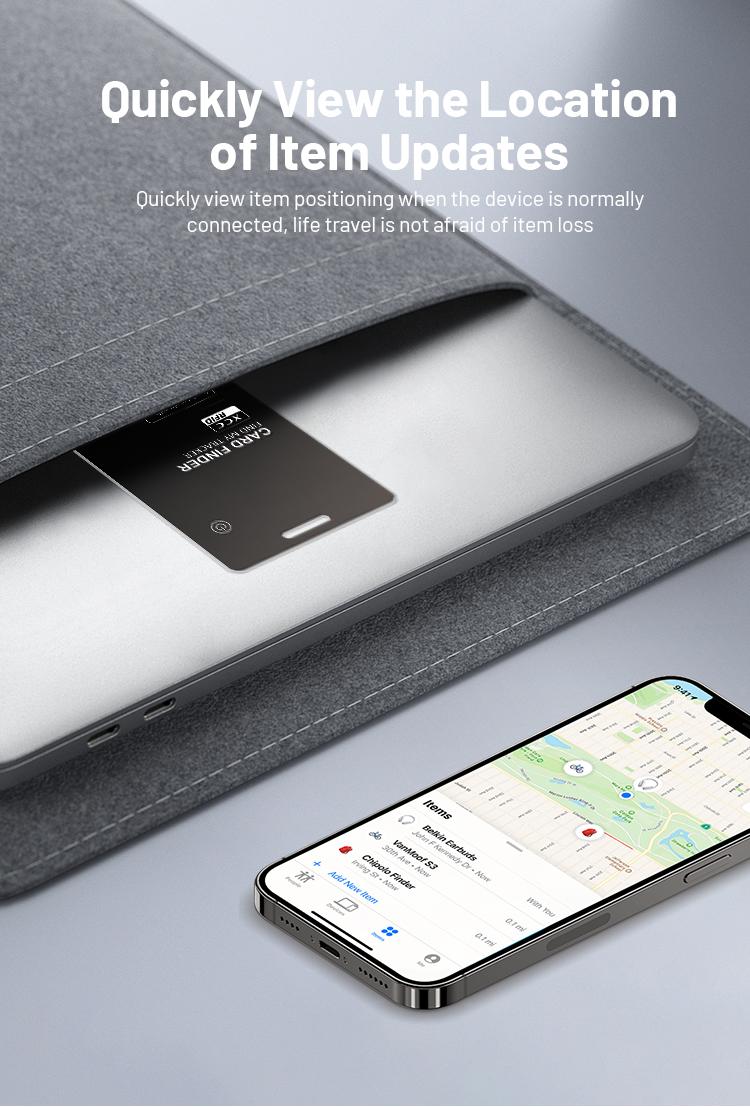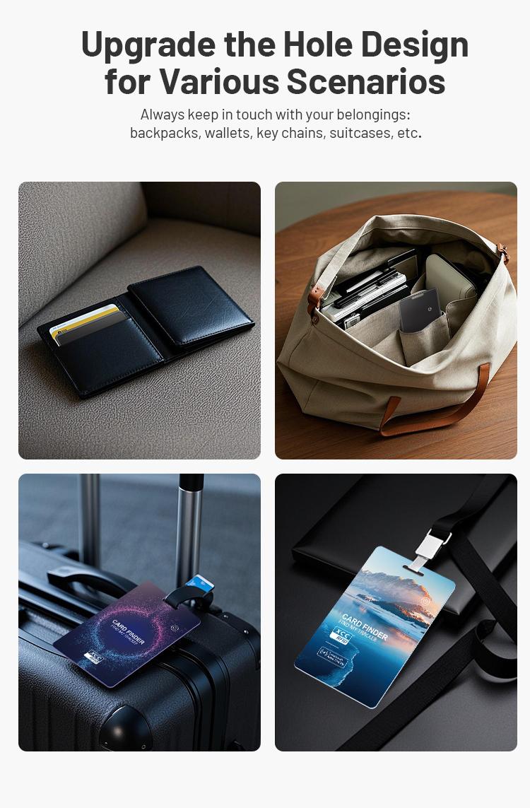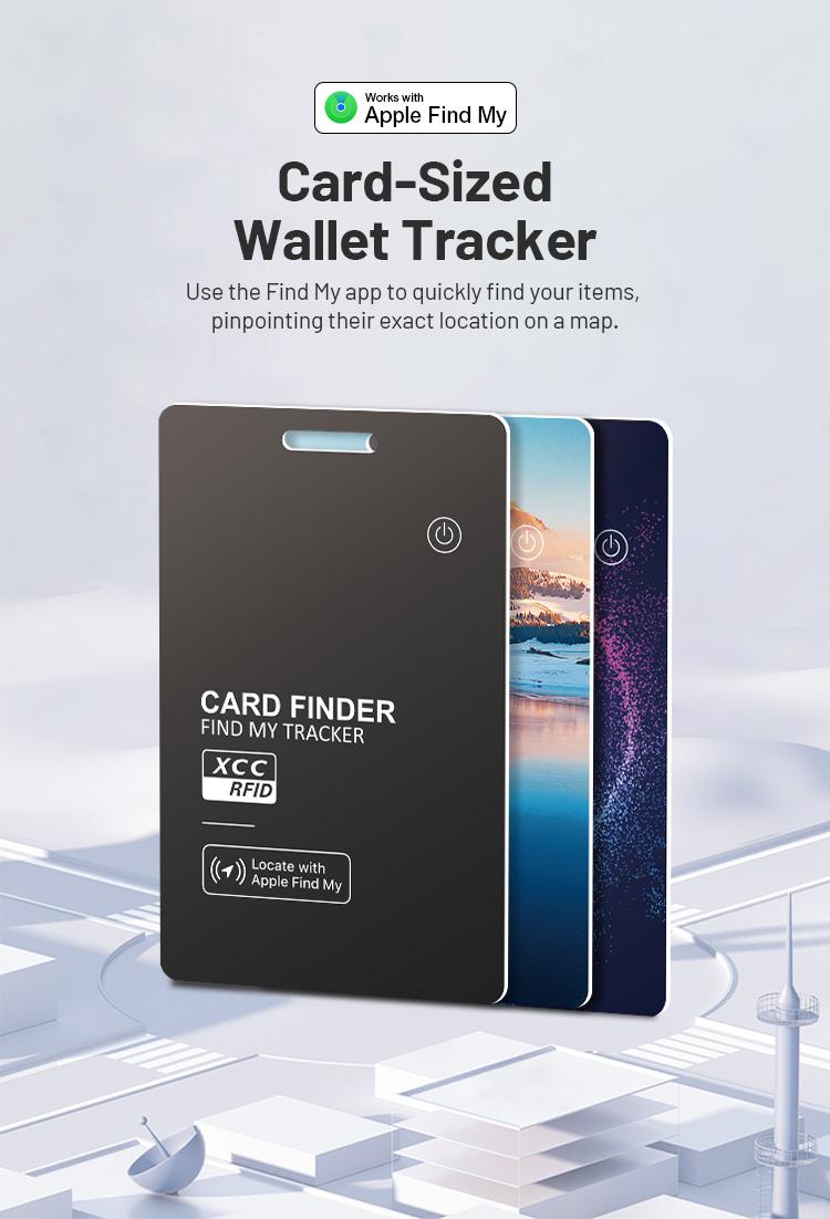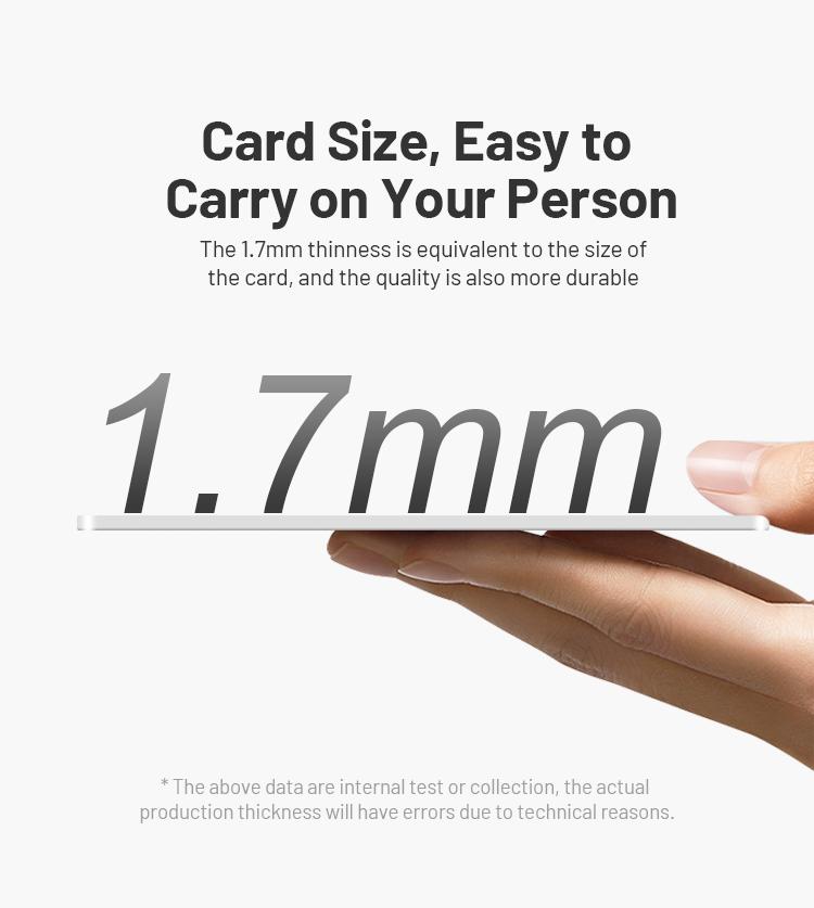 wallet tracker card features an ultra-slim design, approximately 1.7mm thin, seamlessly fitting into most wallets. It is designed to attach securely to wallets, ID cards, and luggage tags for added
